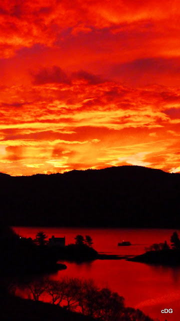 There are occasional days when the rising sun illuminated the underside of low cloud. When that cloud is broken then the light and colours are are their best, most varied, most intense, most contrasty. These days occur perhaps 5 or 6 times in a year, and seldom as good as this. The moments when the dawn is showing at its best are short, maybe seconds, and never more than a minute or two. I would have missed this light show but for the puppy barking furiously at the predawn colours as they intensified. I guess a suddenly blood red world is a bit startling to a 7 month puppy. Some additional interest is added by the Sula Mhor foot ferry. This is one of the ferries providing a limited service across the Strome Narrows while the A890 is closed east of Stromeferry due to a rock fall and increasingly unstable cliff geology.